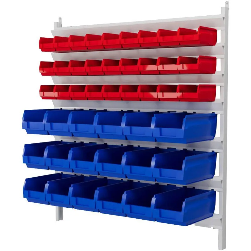 Стеллаж металлический настенный метизный с ящиками. Разборная конструкция для удобного хранения и транспортировки. Настенное крепление, что позволяет сэкономить пространство. Возможность дополнять конструкцию дополнительными траверсами для крепления ящиков. В комплект уже входят пластиковые метизные ящики (ящик «Санремо» — 27 штук, ящик «Верона» — 18 штук). Данная модель торгового оборудования предназначена для хранения и выкладки метизов (шайбы, болты, винты, гайка, шпильки и прочие металлические крепежи). Она, несомненно, станет незаменима на складах и в магазинах, в зонах свободной выкладки.