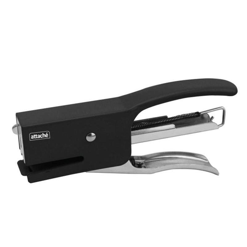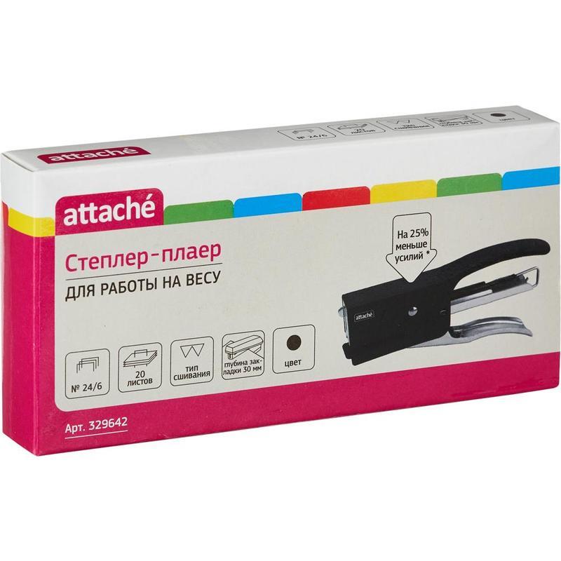 Степлер-плаер Attache одновременно сшивает до 20 листов плотностью 80 г/кв.м. Позволяет производить сшивание закрытым способом. Глубина закладки бумаги — 30 мм (3 см). Встроенный рычаг обеспечивает мягкое сшивание, благодаря чему рука не устает и прилагается на 25% меньше усилий. Корпус выполнен из металла черного цвета. В степлере используются скобы № 24/6, 26/6. Размер изделия: ДхШхВ 146х74х27 мм.