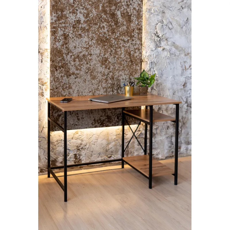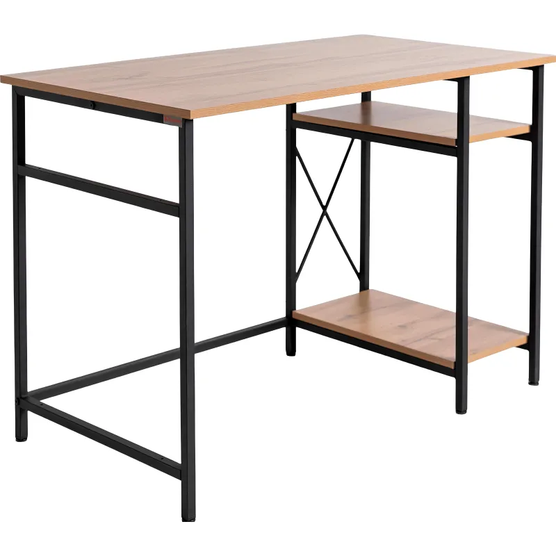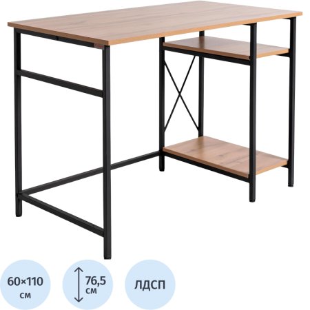 Стол компьютерный Комус Онега 5 (дуб вотан, 1100×600×765 мм). Каркас столов изготовлен из профильной квадратной трубы сечением 20 мм с порошковым полимерным покрытием на регулируемых опорах. Столешница и полки — ЛДСП толщиной 16 мм. Цвет каркаса — черный муар. Максимальная распределенная нагрузка на столешницу до 100 кг, на полки до 20 кг. 2 варианта сборки стола (правый или левый).