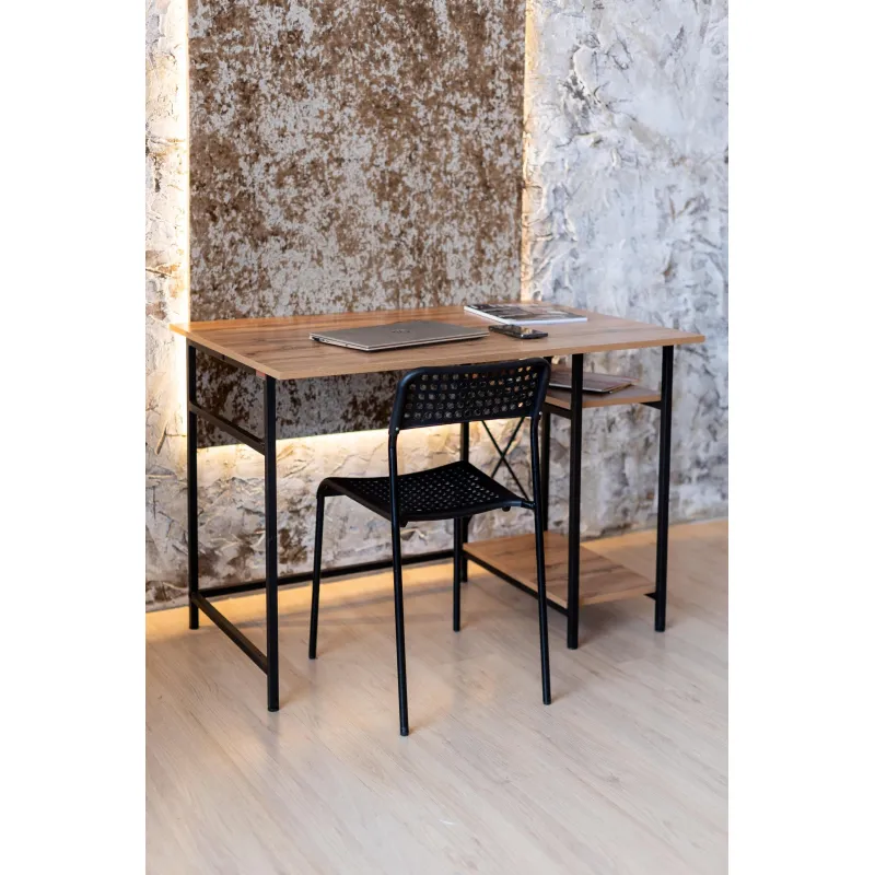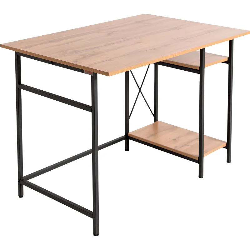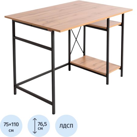 Стол компьютерный Комус Онега 5 (дуб вотан, 1100×750×765 мм). Каркас столов изготовлен из профильной квадратной трубы сечением 20 мм с порошковым полимерным покрытием на регулируемых опорах. Столешница и полки — ЛДСП толщиной 16 мм. Цвет каркаса — черный муар. Максимальная распределенная нагрузка на столешницу до 100 кг, на полки до 20 кг. 2 варианта сборки стола (правый или левый).