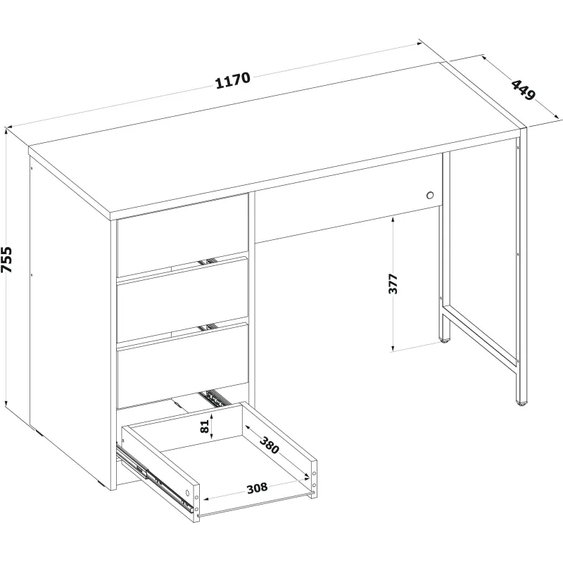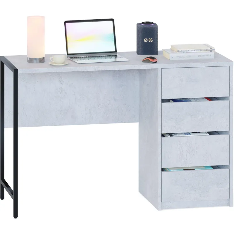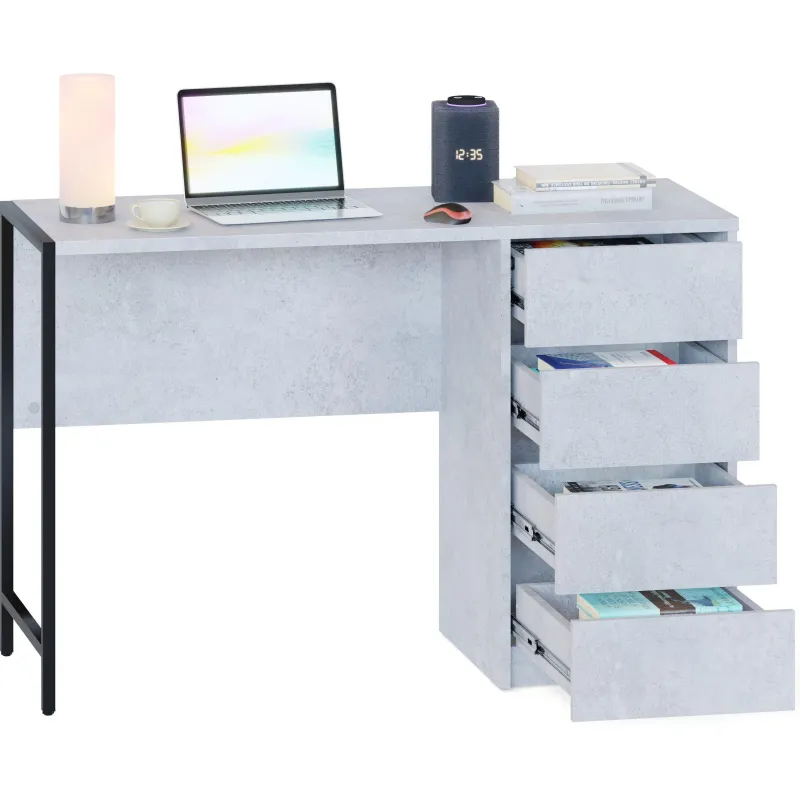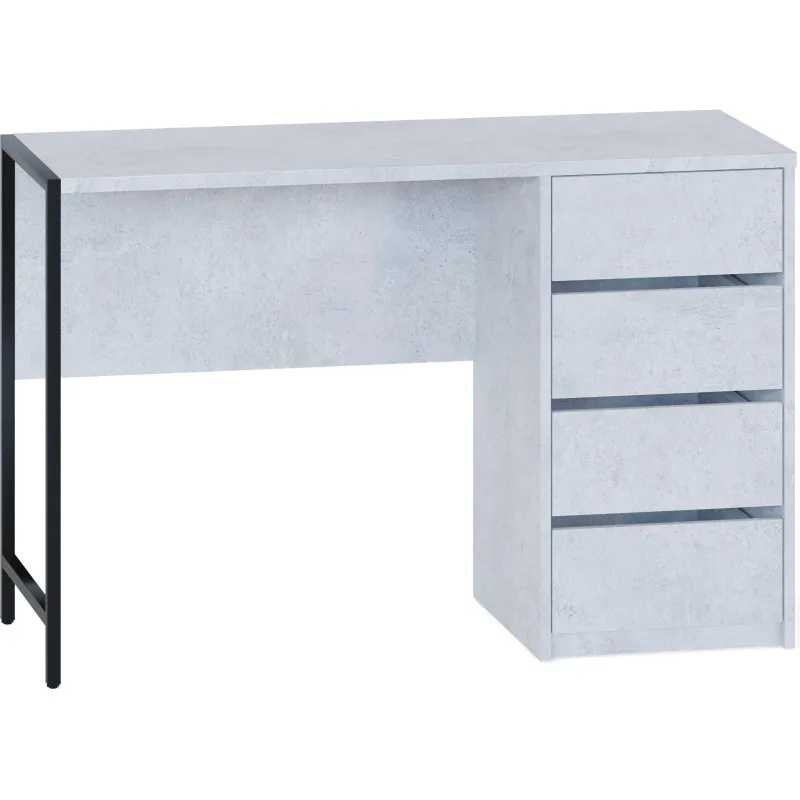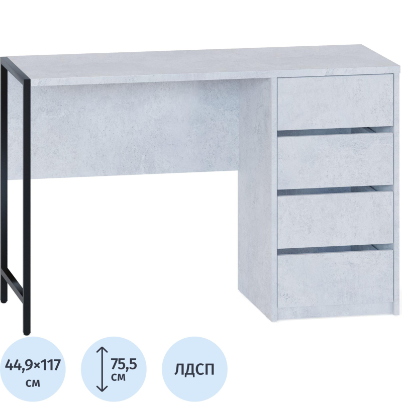 Стильный письменный стол СПМ-405 идеально подходит для организации полноценного рабочего места, эффективно задействуя пространство в доме или офисе. За счёт интересного решения с металлическими опорами на регулируемых подпятниках и столешницы толщиной 22 мм с противоударной кромкой создаётся современная обстановка в стиле лофт. Модель оснащена вместительной тумбой с четырьмя ящиками, а также столешницей шириной 1130 мм и глубиной 449 мм для удобного хранения всей необходимой канцелярии и документов. Ящики с надёжными шариковыми направляющими обеспечивают плавное бесшумное открывание, а вместо привычных ручек сделаны стильные вырезы между фасадами.