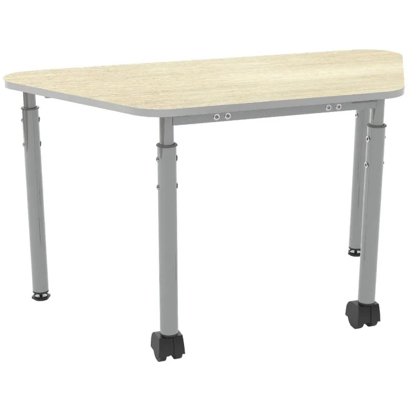 Столешница выполнена из ЛДСП толщиной 16 мм, противоударная кромка ПВХ — 2 мм. Опоры разборные, выполнены из металлических труб диаметром 30×1.5 мм и 40×1.5 мм, окрашены методом порошкового напыления. Регулировка на ростовые группы путем телескопического соединения с жесткой фиксацией. Высота стола регулируется в четырех диапазонах: 580/640/700/760 мм. Две опоры оснащёны колесами и две пластиковыми заглушками (с возможностью регулировки по неровности пола). Столы могут устанавливаться в форму круга (6 штук), шестиугольника (2 штуки), треугольника (3 штуки) и в линию.