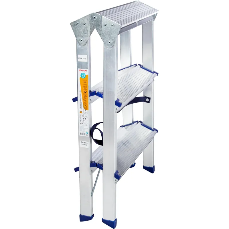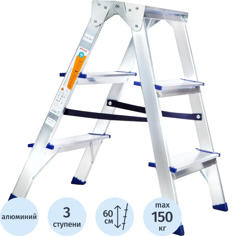 Двухсторонняя стремянка алюминиевая Комус с 3-мя ступенями. Прочное крепление ступеней к боковинам придает конструкции высокую жесткость. Профилированные, противоскользящие наконечники опор для защиты пола. Профессиональная серия. Усиленные стальные кронштейны и профиль толщиной 1,25 мм. Надежная фиксация при раскрывании за счет наличия страховочной стяжки из прочной ленты. Подходит для частого использования как в домашнем, так и в промышленном обиходе.Преимущества изделия:— Прочный алюминиевый каркас — облегченная конструкция, нержавеющая и долговечная— Дополнительная верхняя ступень (площадка)— Рифленая поверхность на ступенях предотвращает скольжение— Простота в обращении— Удобно хранить и транспортировать, благодаря компактным размерам Внешний вид и/или характеристики товара могут быть изменены производителем в соответствии с производственным процессом.