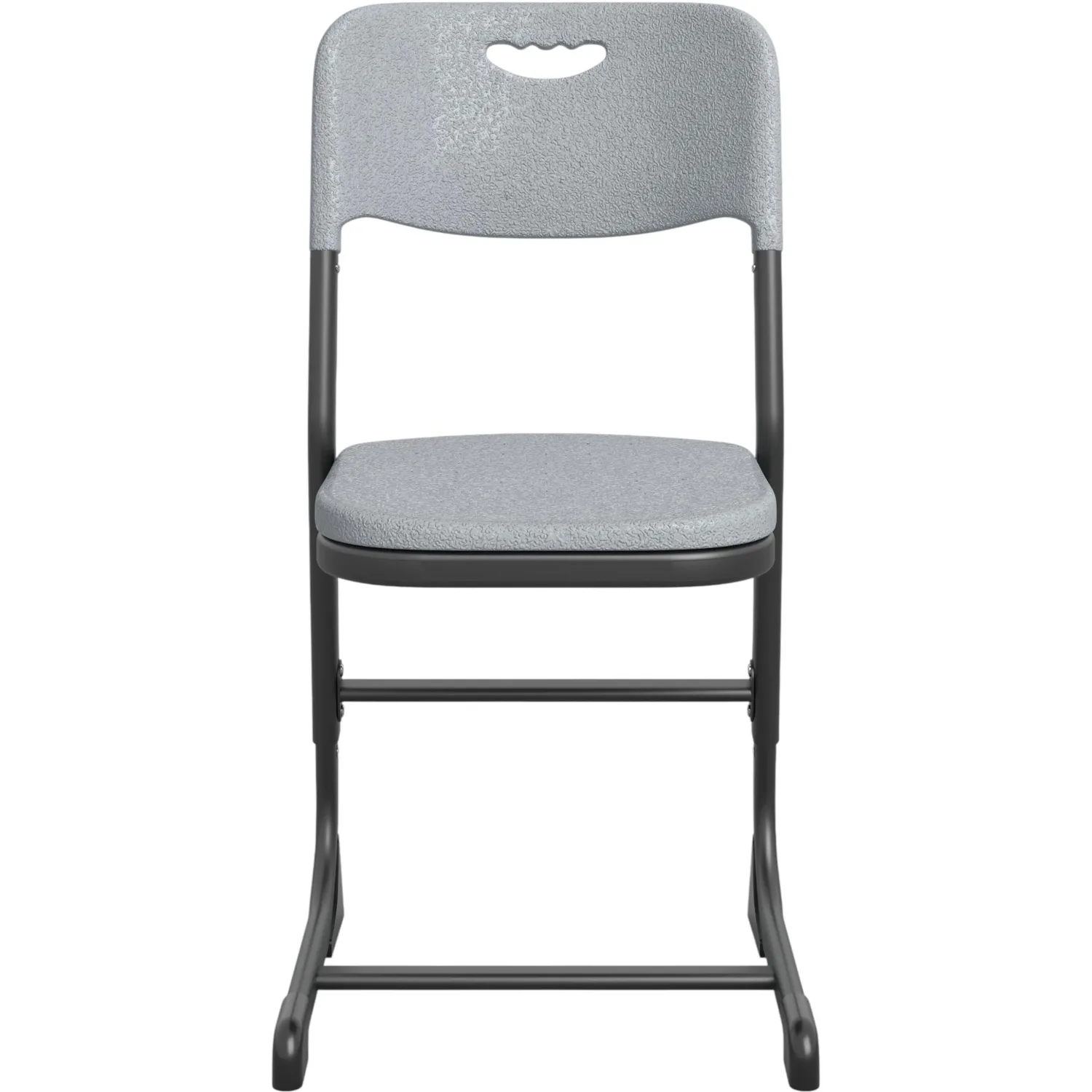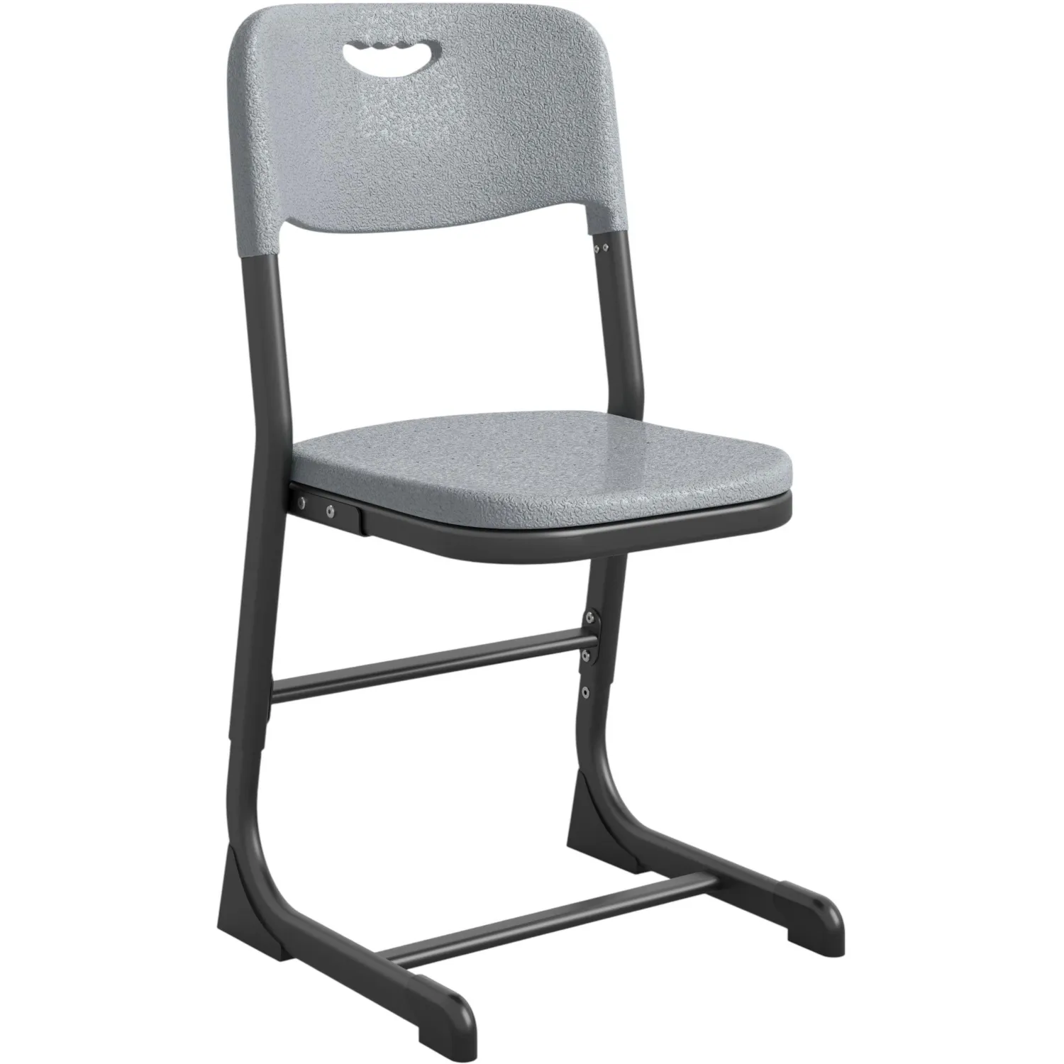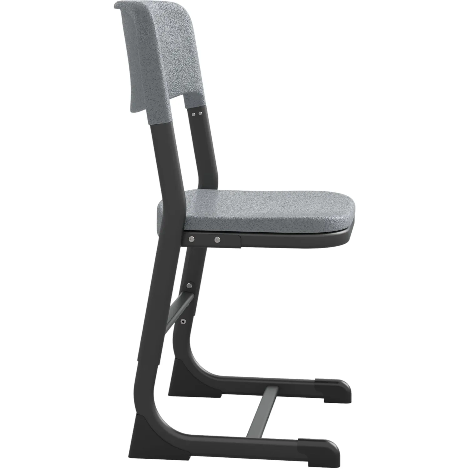 Стул ученический Комус Мебель. Сиденье и спинка пластиковые, изготовлены способом выдувания из ПНД. Сиденье и спинка имеют толщину не менее 30 мм. На спинке стула расположена выемка под руку для удобного перемещения стула. Каркас стула выполнен из плоскоовального металлического профиля 45×25 мм, 40×20 мм и 30×15 мм с толщиной стенок не менее 1,5 мм. Опоры стула L-образной формы имеют телескопический механизм регулировки высоты с пластиковой переходной втулкой. Каркас стула покрыт порошковой краской, стойкой к химическим и механическим воздействиям. На свободных концах труб установлены заглушки из ударопрочных полимеров. Каркас стула имеет полимерные подпятники, предотвращающие повреждение напольного покрытия. Сиденье и спинка крепятся к основанию при помощи мебельных болтов. Для дополнительной жёсткости в нижней части стула между опорами установлена съёмная металлическая траверса. Стул изготавливается в соответствии с ГОСТ 11016-93 и имеет цветовую маркировку в соответствии с ростовой группой.