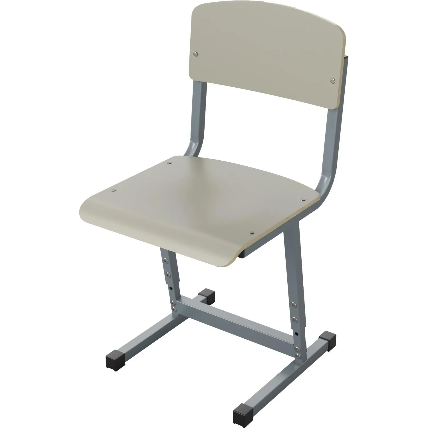 Сиденье и спинка стула изготовлены из гнутоклеенной фанеры толщиной не менее 8 мм, покрытой цветным декоративным пластиком. Крепление сиденья и спинки к каркасу стула осуществляется при помощи мебельных болтов и гаек. Две боковины стула разборные, с регулировкой высоты, выполнены из профиля квадратного сечения 25×25 мм и 20×20мм с толщиной стенок не менее 1,2 мм. Регулировка высоты осуществляется с помощью винтовых соединений с гайкой Эриксона. Стойки стула наклонены вперед на 10 градусов, а спинка имеет угол наклона 95 градусов. Связь выполнена из профиля прямоугольного сечения 25×40 мм с толщиной стенок не менее 1,2 мм и крепится к стойкам стула на 4 болта с гайками Эриксона. Металлокаркас покрыт порошковой краской, стойкой к химическим и механическим воздействиям. На свободных концах труб установлены заглушки из ударопрочных полимеров. Каркас стула имеет полимерные подпятники, предотвращающие повреждение напольного покрытия. Стул имеет цветовую маркировку в соответствии с ростовыми группами. Стул изготавливается в соответствии с ГОСТ 11016-93.