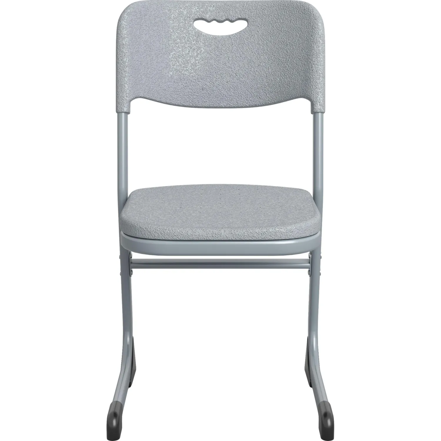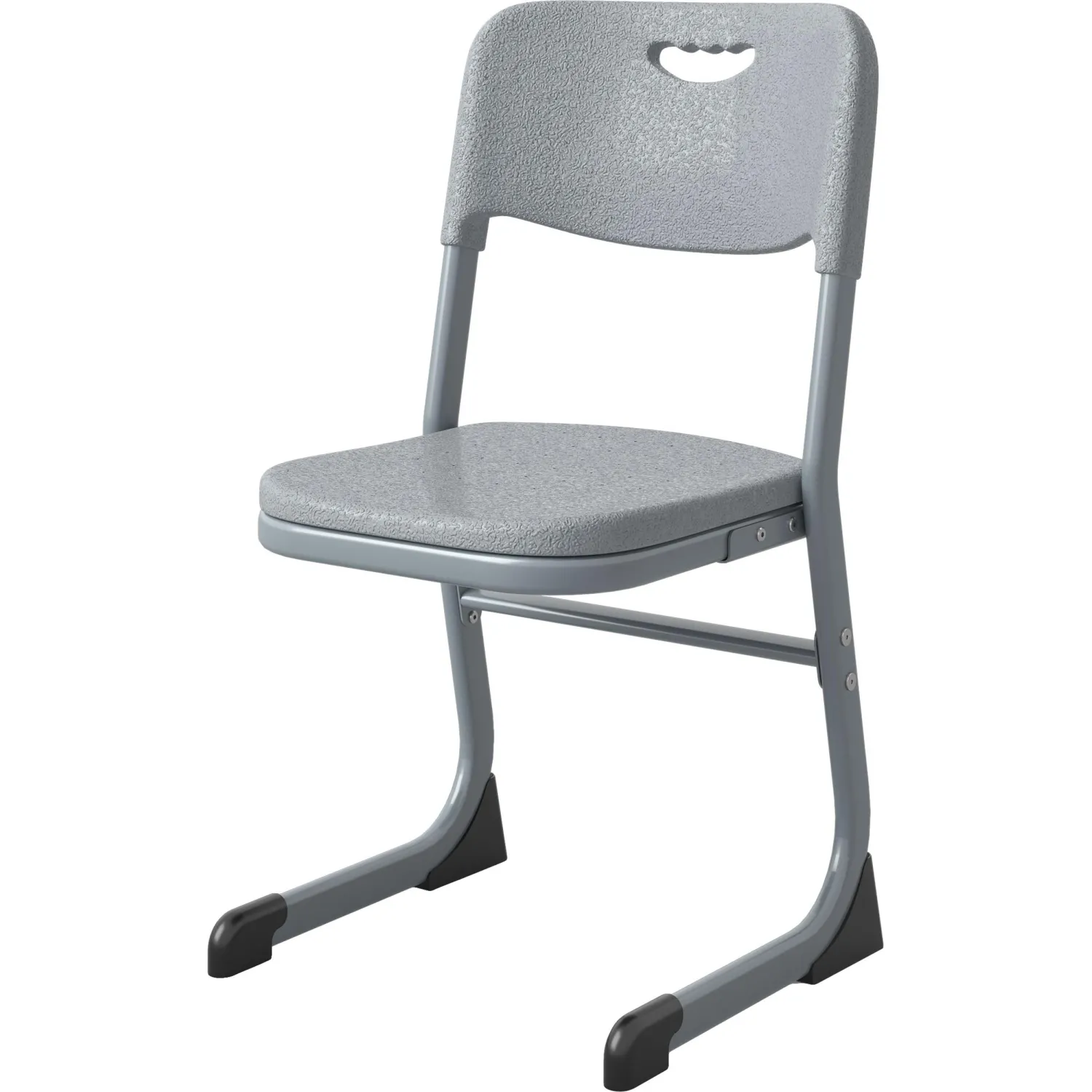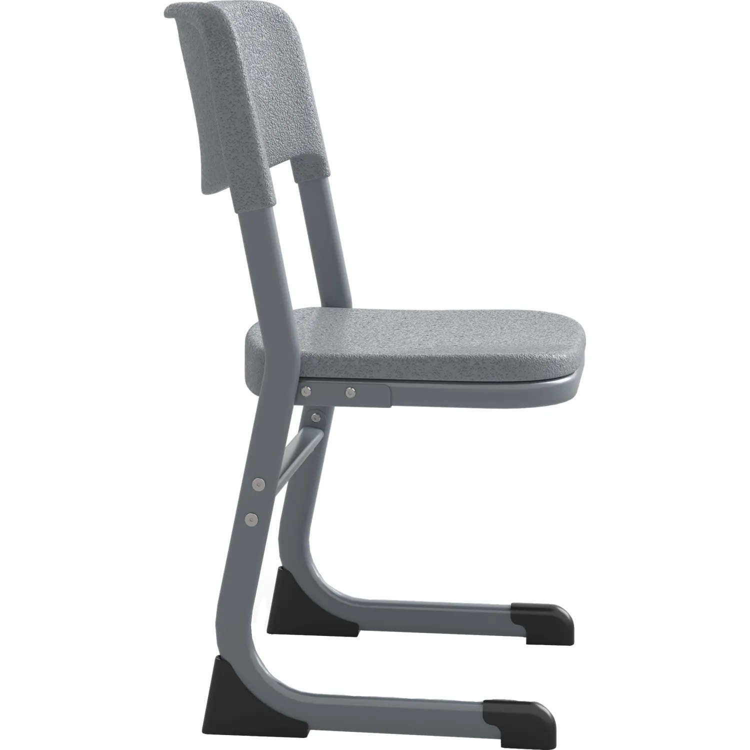 Стул ученический Комус Мебель. Сиденье и спинка пластиковые, изготовлены способом выдувания из ПНД. Сиденье и спинка имеют толщину не менее 30 мм. На спинке стула расположена выемка под руку для удобного перемещения стула. Опоры стула L-образной формы. Каркас стула разборный и выполнен из плоскоовального металлического профиля 40×20 мм и 30×15 мм с толщиной стенок не менее 1,5 мм. Каркас стула покрыт порошковой краской, стойкой к химическим и механическим воздействиям. На свободных концах труб установлены заглушки из ударопрочных полимеров. Каркас стула имеет полимерные подпятники, предотвращающие повреждение напольного покрытия. Сиденье и спинка крепятся к основанию при помощи мебельных болтов. Для дополнительной жёсткости в нижней части стула между опорами установлена съёмная металлическая траверса. Стул изготавливается в соответствии с ГОСТ 11016-93 и имеет цветовую маркировку в соответствии с ростовой группой.