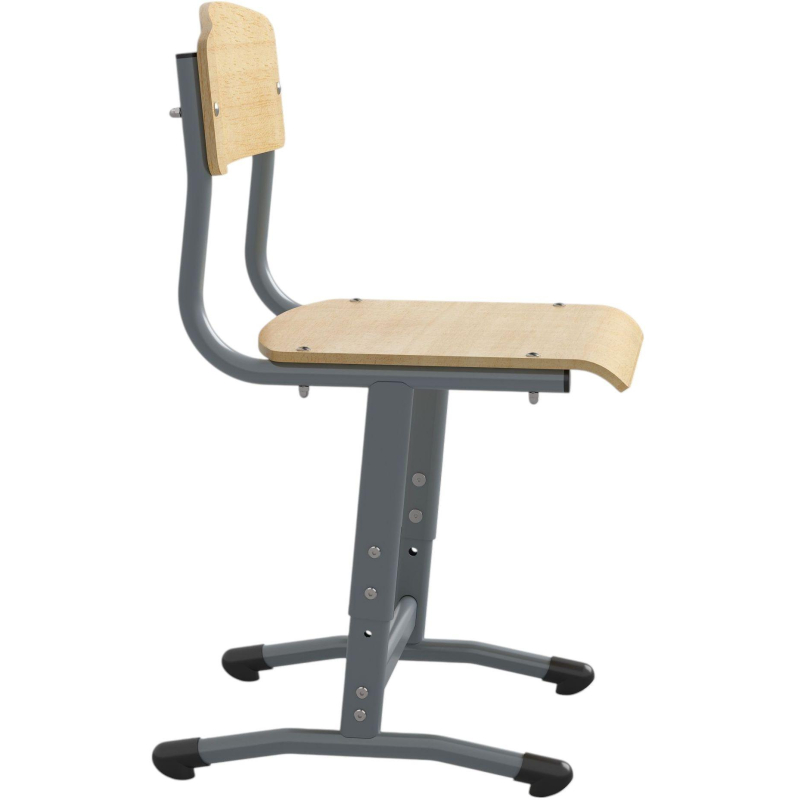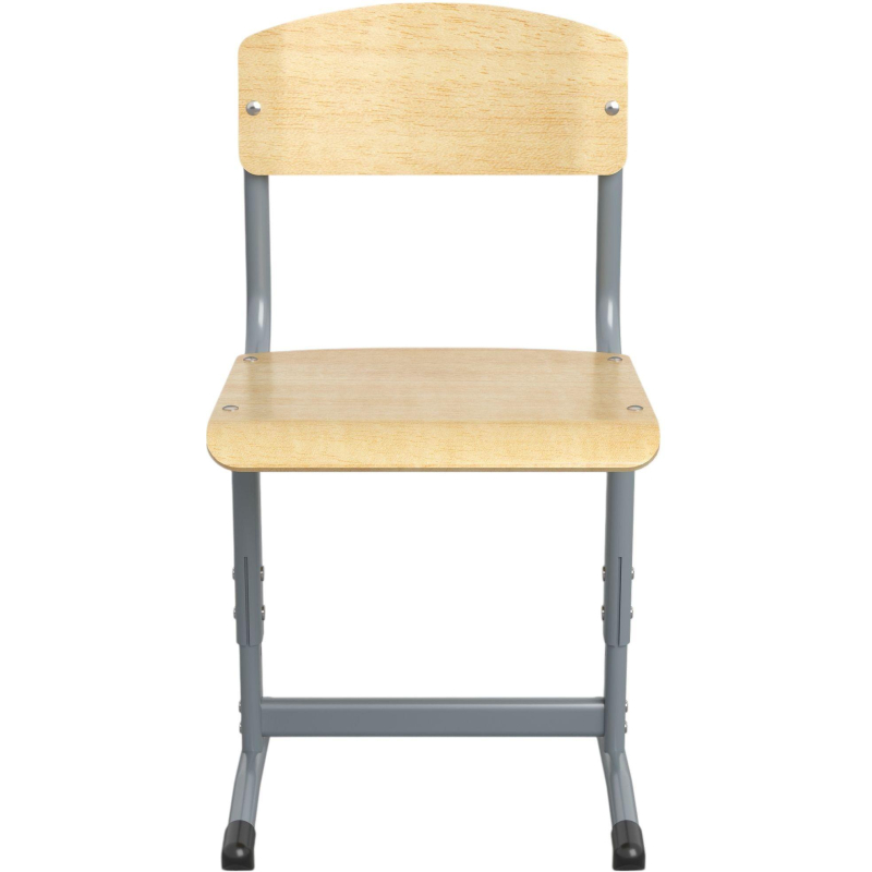 Стул ученический Универсал. Сиденье и спинка изготовлены из гнутоклеёной фанеры толщиной не менее 8 мм и покрыты бесцветным лаком. Металлический каркас разборный и выполнен из профиля круглого сечения диаметром 25 мм с толщиной стенки не менее 1,5 мм и плоскоовального профиля 40×20 мм и 45×25 мм с толщиной стенки не менее 1,5 мм, покрыт порошковой краской, стойкой к химическим и механическим воздействиям. На свободных концах труб установлены заглушки из ударопрочных полимеров. Каркас стула имеет полимерные подпятники, предотвращающие повреждение напольного покрытия. Сиденье и спинка крепятся к основанию при помощи мебельных болтов и гаек. Стойка стула имеет наклон вперёд 5 градусов. Механизм регулировки высоты — телескопический. Регулировка высоты осуществляется с помощью винтовых соединений с гайкой Эриксона. Нижняя опора стула имеет изогнутую форму с двумя точками изгиба. Стул имеет цветовую маркировку в соответствии с ростовой группой. Стул изготавливается в соответствии с ГОСТ 11016–93.