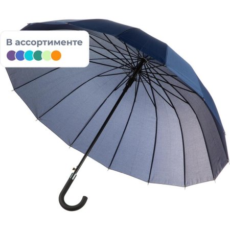 Зонт — трость, полуавтоматический, длина зонта 90 см, диаметр купола 115 см, купол из 100% полиэстера, с водоотталкивающей пропиткой, система «Анти ветер». 16 стальных спиц. Цвет в ассортименте.