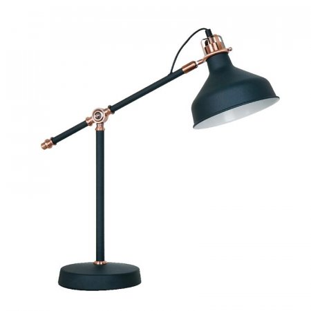 Современный универсальный настольный светильник, изготовленный из металла, для освещения рабочего места на столе в офисе и дома. Дизайн плафона с бархатистой, фактурной окраской и элементами из меди придаёт светильнику дополнительную оригинальность и привлекательность. Устанавливается на горизонтальной поверхности. Двузвенная металлическая стойка светильника позволяет регулировать высоту и наклон плафона в широком диапазоне. В качестве источника света может использоваться лампа мощностью до 40 Вт с цоколем E27. Длинный провод (1,6 м) позволяет легко перемещать светильник по поверхности стола. Выключатель — на проводе светильника.