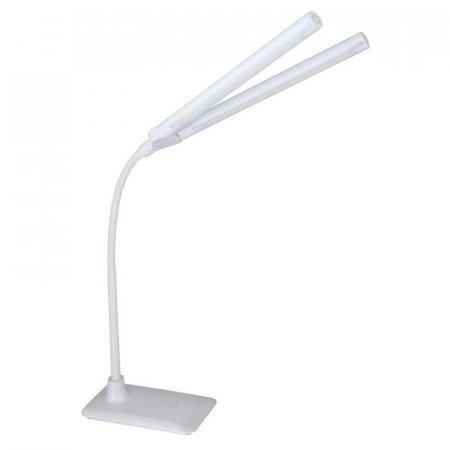 Современный светодиодный настольный светильник Camelion KD-794, имеющий два независимо регулируемых по яркости плафона (каждый имеет 4 уровня яркости), предназначен для освещения персонального рабочего места. Светильник устанавливается на горизонтальную рабочую поверхность, не скользит по столу и не опрокидывается при любом наклоне плафонов. Угол поворота между плафонами регулируется в диапазоне 0-200 градусов. Благодаря наличию 2-х плафонов светильник может освещать 2 рабочих места или освещать большую площадь одного рабочего места. Идеально подходит для освещения рабочего места школьника, студента, офисного работника. Гибкая металлическая стойка в силиконовой оболочке позволяет регулировать положение плафонов. Выключатели сенсорные − находятся на торцевой части плафонов светильника. Длинный провод (более 1,7 м) позволяет перемещать светильник по поверхности стола. Световой поток (макс.) − 760 лм. Яркий, но мягкий естественный свет светодиодов (4000 К) без мерцания позволяет человеку проводить много времени за рабочим столом без утомления и вреда для глаз.