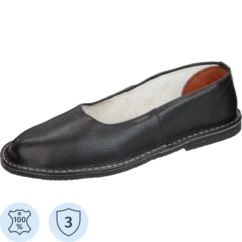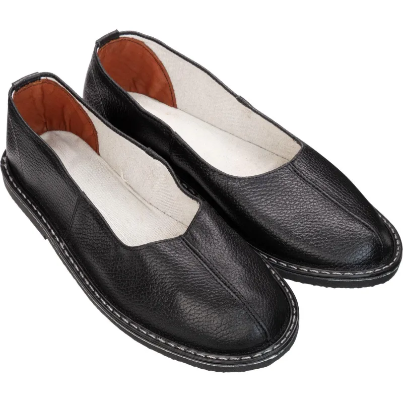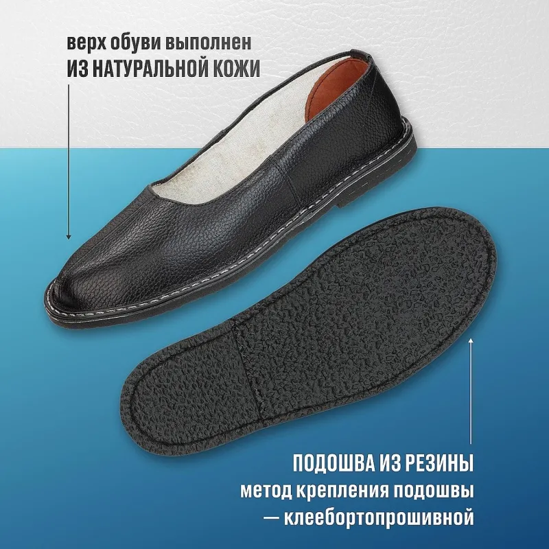 Тапочки кожаные (чувяки) размер 37. Модель черного цвета, подходит как для мужчин, так и для женщин. Предназначены для использования в закрытых помещениях, в частности для работников текстильной промышленности, а также могут использоваться в других областях легкой промышленности.