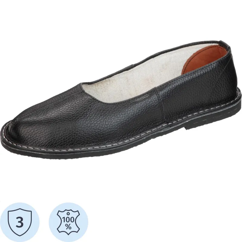 Тапочки кожаные (чувяки) размер 40. Модель черного цвета, подходит как для мужчин, так и для женщин. Предназначены для использования в закрытых помещениях, в частности для работников текстильной промышленности, а также могут использоваться в других областях легкой промышленности.