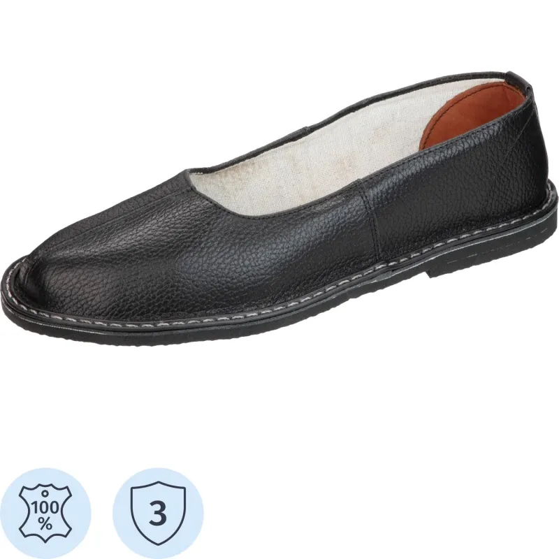 Тапочки кожаные (чувяки) размер 43. Модель черного цвета, подходит как для мужчин, так и для женщин. Предназначены для использования в закрытых помещениях, в частности для работников текстильной промышленности, а также могут использоваться в других областях легкой промышленности.