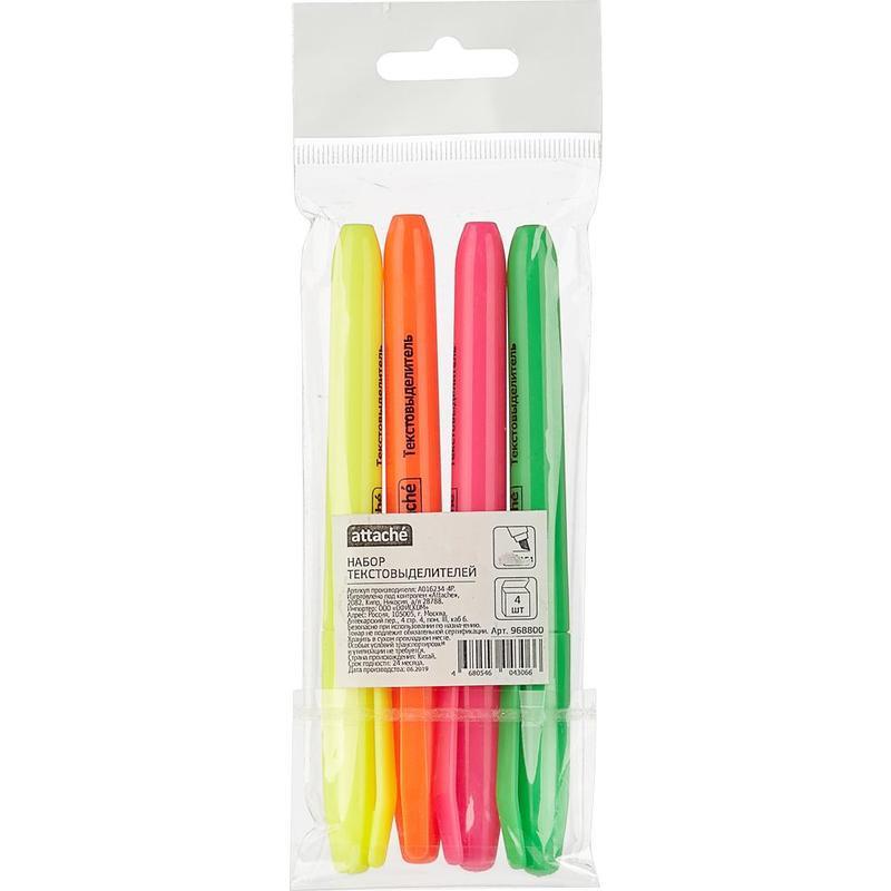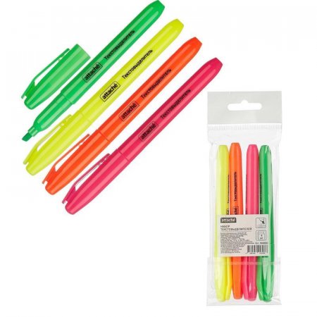 Набор текстовыделителей Attache в пластиковом корпусе, предназначенных для маркировки текста на бумаге любой плотности. Чернила на водной основе, цвет чернил соответствует цвету корпуса. Скошенный наконечник позволяет провести линию толщиной 1-3,9 мм. В наборе 4 цвета: розовый, желтый, зеленый, оранжевый.