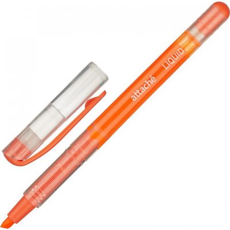 Текстовыделитель в пластиковом корпусе с жидкими чернилами, предназначенный для маркировки текста на бумаге любой плотности, цвет чернил: оранжевый — соответствует цвету колпачка. Скошенный наконечник имеет толщину от 1 до 4 мм.