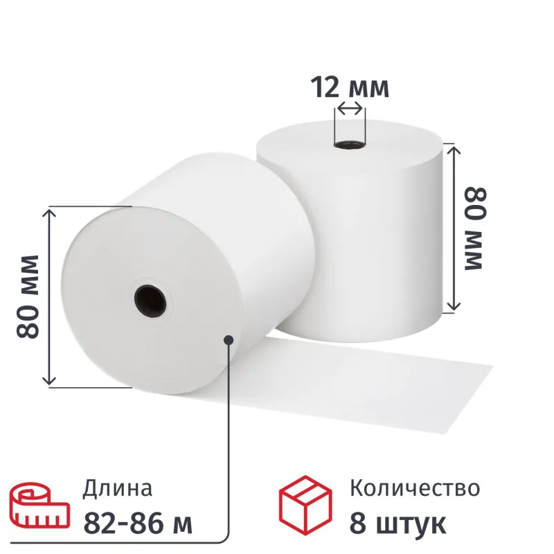 Чековая лента изготовлена из термобумаги. Бумажное полотно с наружным термослоем имеет ширину 80 мм и общую длину 84-85 метров. Диаметр намотки — 80, диаметр втулки — 12 мм. Поставляются в термоусадочной пленке и гофрокоробах. Ролики для термопечати используются в кассовых аппаратах и калькуляторах со встроенным или внешним термопринтером. Цвет печати — черный.