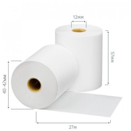 Чековая лента изготовлена из термобумаги. Бумажное полотно с наружным термослоем имеет ширину 57 мм и общую длину 27 метров. Диаметр намотки — примерно 40–42 мм, диаметр втулки — 12 мм. Поставляются в термоусадочной пленке и гофрокоробах. Ролики для термопечати используются в кассовых аппаратах и калькуляторах со встроенным или внешним термопринтером. Цвет печати — черный.