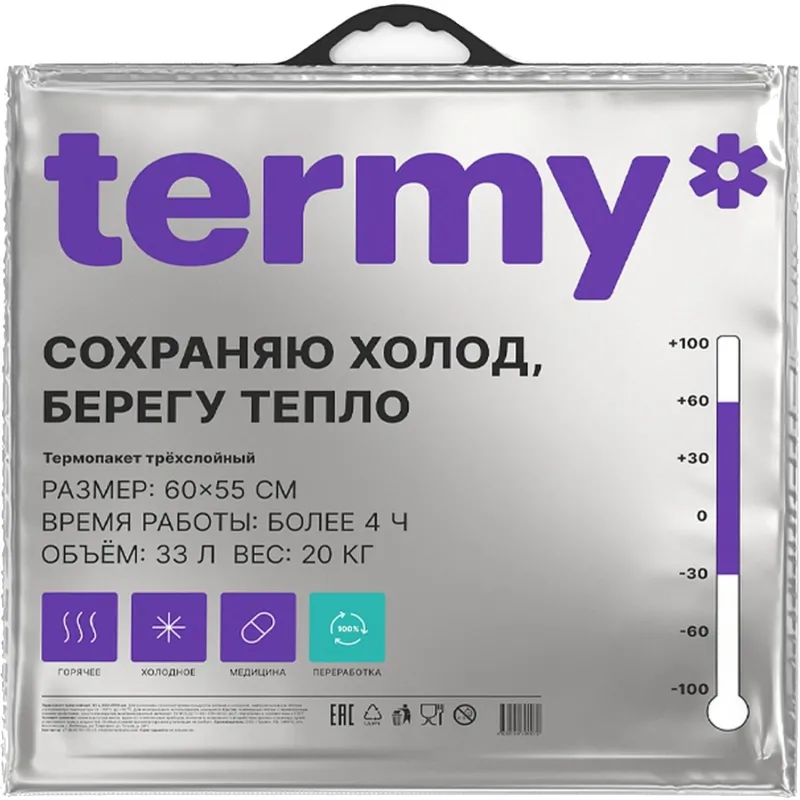 Термопакет с дном наиболее удобен для транспортировки продуктов в контейнерах или ланч-боксах. Сохранит температуру более 4 часов.