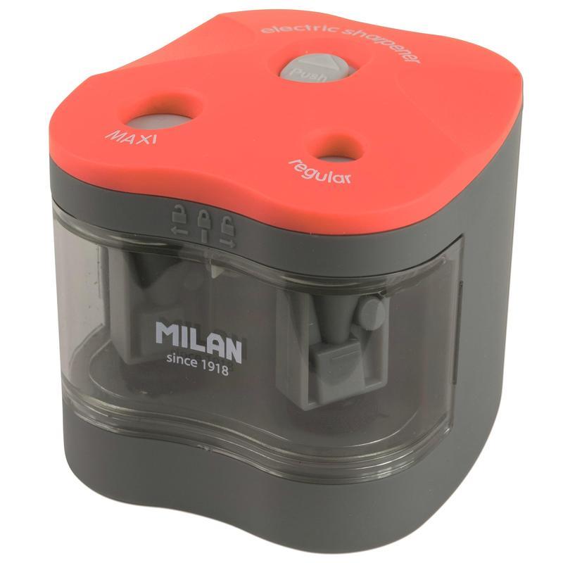 Двойная электрическая точилка для карандашей с контейнером. Точилка для стандартных и утолщенных карандашей c прочным лезвием из углеродистой стали, со встроенной системой безопасных лезвий, которая предотвращает возможные порезы. Съемная передняя крышка для очищения контейнера. Цвет: серый и красный. 4 батарейки АА в комплекте.