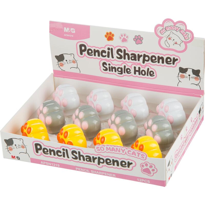 Компактная ручная точилка M&G So Many Cats для карандашей изготовлена из пластика. Имеет форму кошачьей лапки и предназначена для заточки цветных и чернографитных карандашей диаметром 8 мм. Поставляется в трех цветах: белый, желтый и серый. Размер: 30×36×18 мм.Внимание! Товар поставляется в различных вариантах дизайна/цвета без возможности выбора.