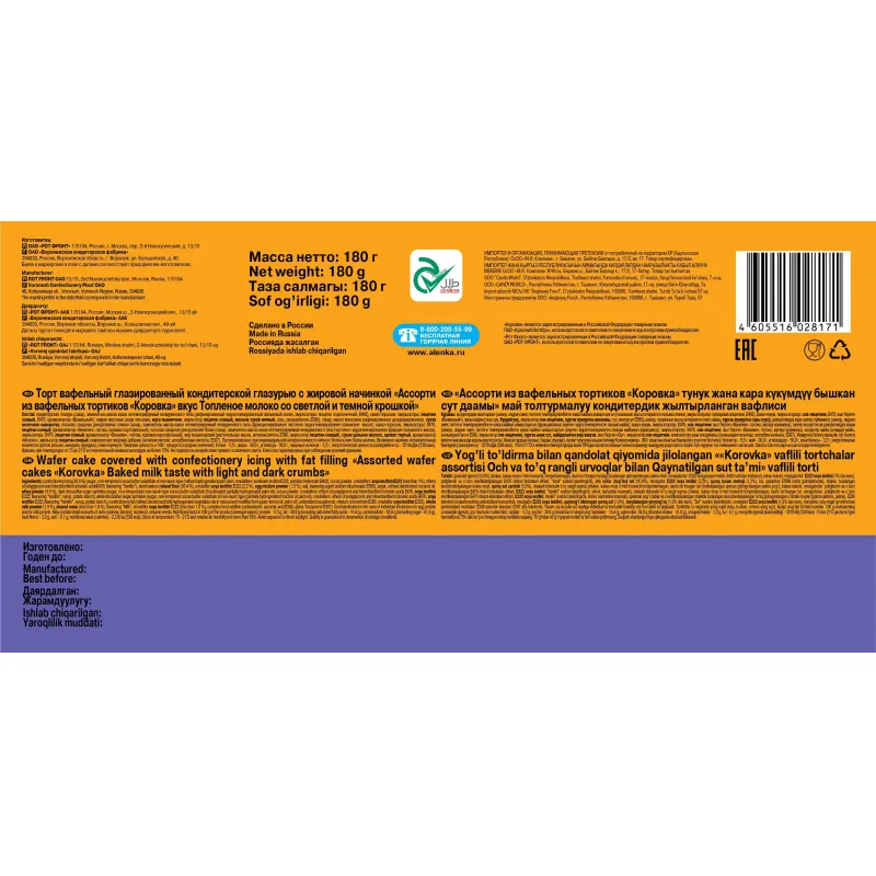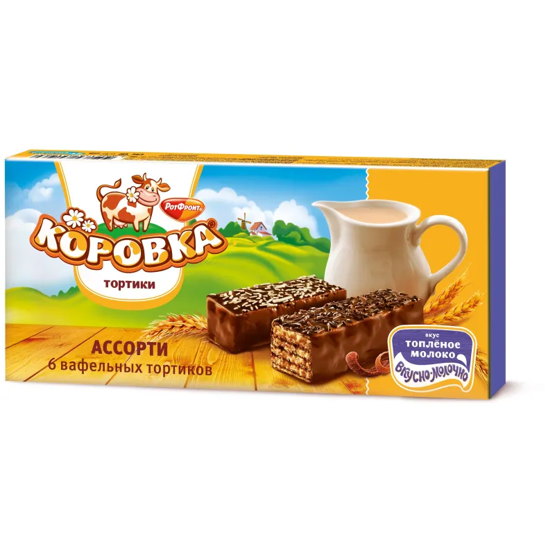 Вафельный торт «Коровка» с топлёным молоком сочетает хрустящие вафельные слои с нежной молочной начинкой, создавая мягкий карамельно-сливочный вкус. Каждый торт весом 180 г упакован в картонную коробку.