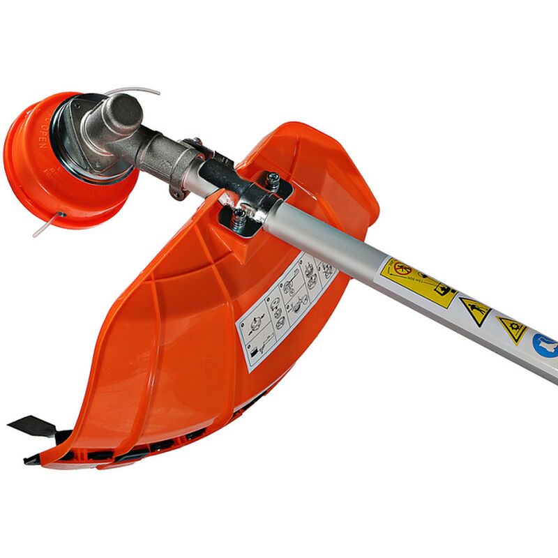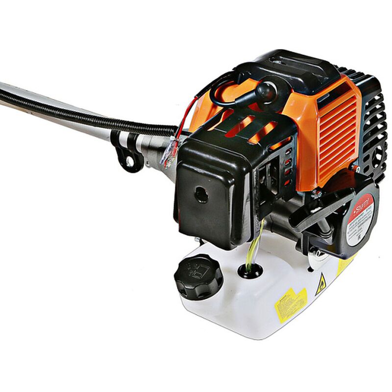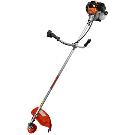 Модель оснащена мощным и экономичным двухтактным двигателем рабочим объемом 42.7 см³ (мощность 3 кВт), позволяющим уверенное использование в качестве режущей оснастки не только косильных головок с леской разных видов, но и металлических ножей, рассчитанных на скашивание густой травы, кустарников, сухостоя. Легкость запуска инструмента гарантирует механизм облегченного старта со специальной дополнительной пружиной. Благодаря праймеру, легкому доступу к свече зажигания, и, полупрозрачному топливному баку модель проста и удобна в обслуживании. Инструмент имеет расширенную базовую комплектацию, куда входят ременной подвес (через одно плечо), косильная головка для лески и трехзубый нож.