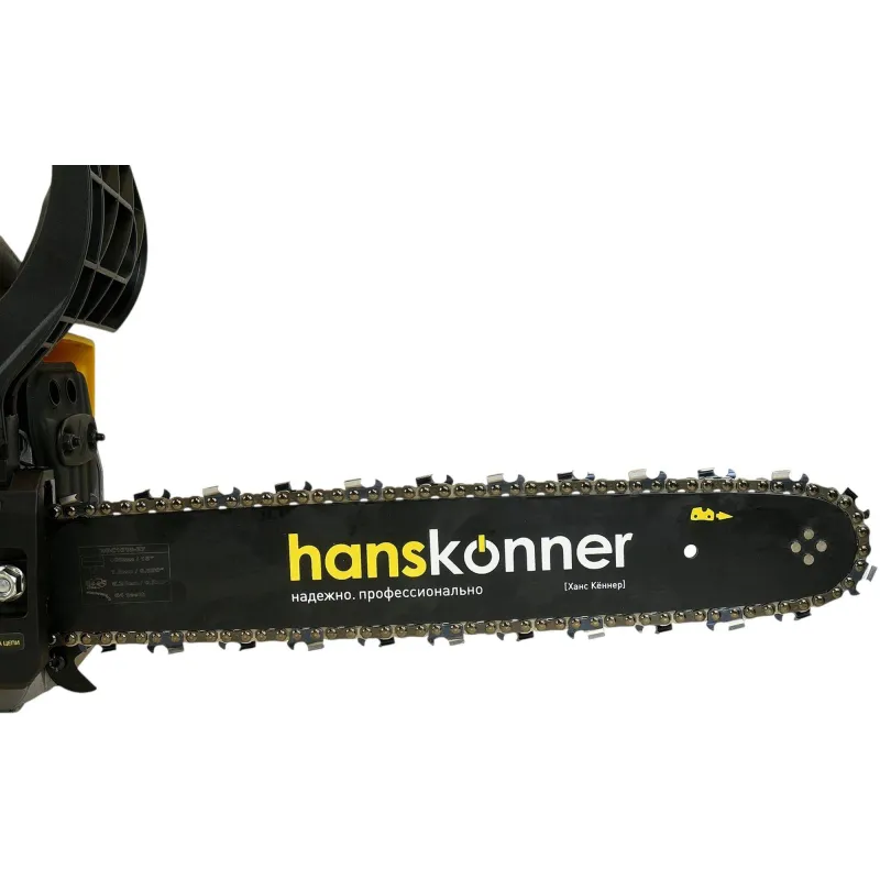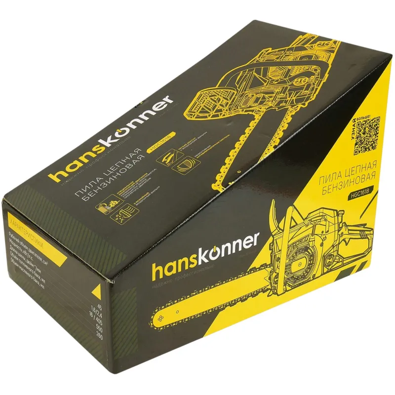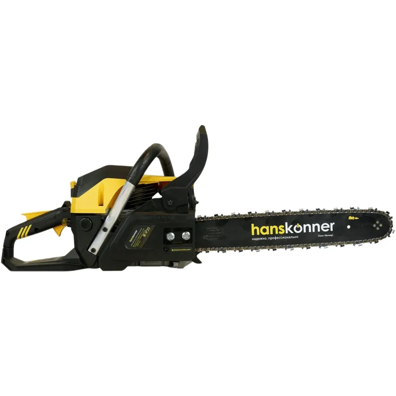 Цепная бензиновая пила Hanskonner HGC1618 — мощный бытовой инструмент. Рабочий объем двухтактного двигателя — 45 куб. см, количество оборотов — 3 200 об/мин, мощность 1600 Вт (2,4 л/с). Длина шины — 16 дюймов. Объем топливного бака — 0,55 л, объем масляного бака — 0,26 л. Этих показателей хватит для решения любых бытовых задач — от заготовки дров, обрезки деревьев до проведения строительных работ.