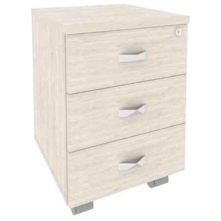 Тумба Onix O.ТМ-3. Крышка изготовлена из ЛДСП толщиной 25 мм, остальные детали имеют толщину 18 мм. Тумба стоит на колесных опорах, направляющие роликовые. Задняя стенка ЛДСП. Центральный замок фиксирует в закрытом положении все три ящика тумбы. Опоры колесные, две опоры с тормозом, две без тормоза. Цвет покрытия денвер светлый. Материал и толщина топа и кромки: ЛДСП 25 мм. Материал и толщина каркаса и кромки: ЛДСП 18 мм, ПВХ 0,4 мм. Материал и толщина задней стенки: ЛДСП 18 мм.