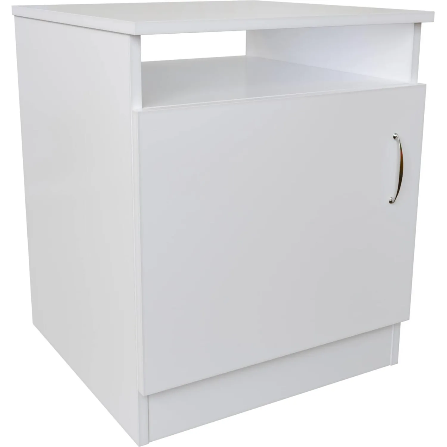Тумба выполнена из ЛДСП толщиной 16 мм. Торцы столешницы и фасадов закрыты противоударной кромкой ПВХ. Фасад оснащен металлической ручкой. За распашным фасадом расположена съемная полка.