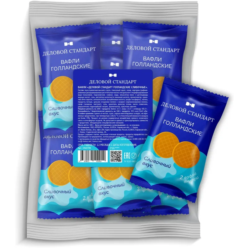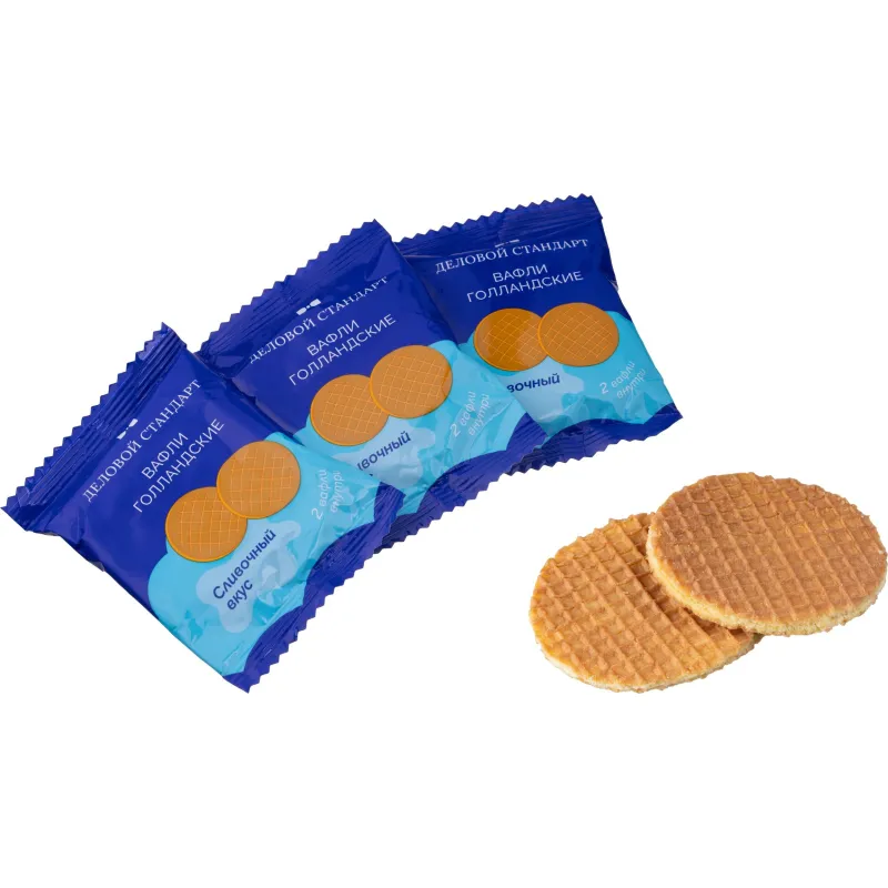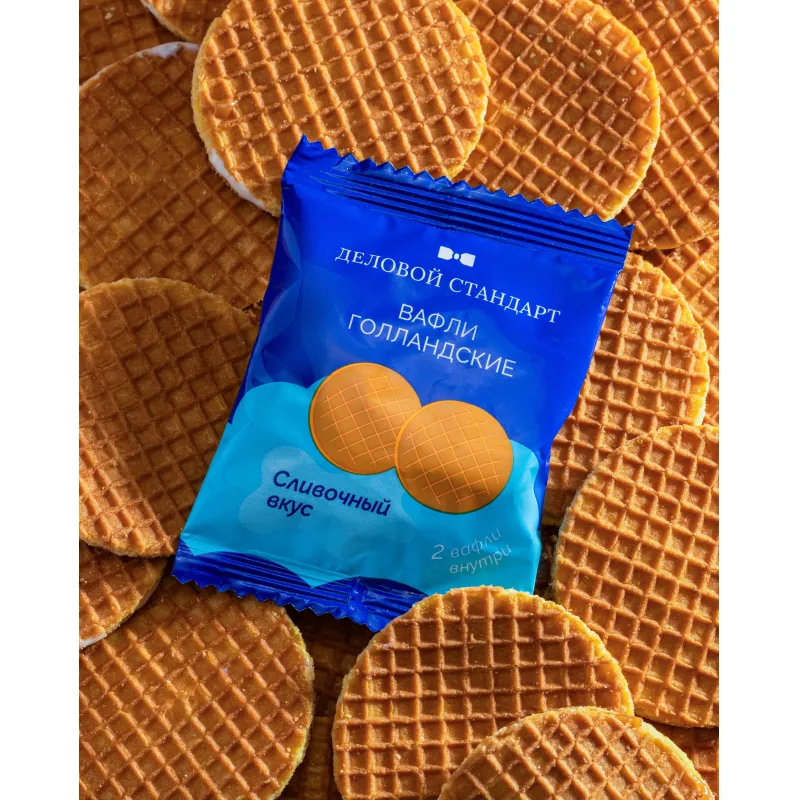 Вафли голландские Деловой стандарт со сливочной начинкой 500 г — 2 вкусные вафли по 60 мм в индивидуальной упаковке. Отличаются нежным вкусом и насыщенным ароматом. Идеальны для чаепития, утреннего или вечернего перекуса.