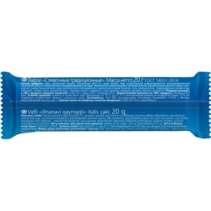 Вафли Коломенский сливочные 20 г (154 штуки в упаковке)