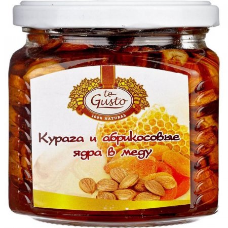 Курага содержит большое количество минеральных веществ, органических кислот и пектинов, которые улучшают обмен веществ, а также эффективно выводят из организма тяжелые металлы. Курага и мед — известные средства укрепления сердца, повышения гемоглобина. Врачи рекомендуют курагу при анемии, ослабленном зрении, сердечных болезнях. Она предотвращает закупорку сосудов, смягчает твердые опухоли, омолаживает кожу и укрепляет волосы. Абрикосовые ядра помогут при снижении аппетита, малокровии, туберкулезе, заболеваниях печени, при хронических заболеваниях почек, сопровождающихся отеками. Систематическое употребление благотворно влияет на функции щитовидной железы.Состав: абрикосовые косточки, курага, мед.Пищевая ценность на 100 г продукта: белки — 6,5 г, жиры — 9,1 г, углеводы — 59,7 г.Энергетическая ценность на 100 г продукта: 339 ккал.Упаковка: стеклянная банка объемом 300 г с откручивающейся крышкой.Условия хранения: в чистых сухих помещениях при температуре от 0 до +25 градусов Цельсия, без доступа прямых солнечных лучей, при относительной влажности воздуха не более 75%.Срок годности: 2 года.Производитель: ООО «УК „Базис групп“».Страна производства: Киргизия.