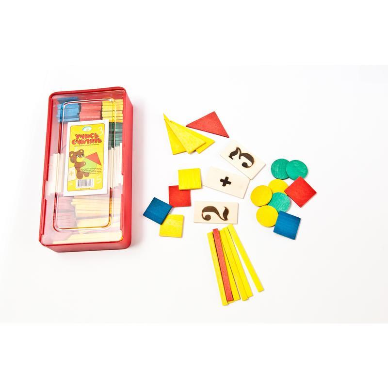 Набор «Учись считать» состоит из следующих деталей:Счётные палочки — 20 штук.Круги — 30 штук.Квадраты — 30 штук.Треугольники равносторонние — 10 штук.Треугольники с прямым углом и углами 30 и 60 градусов — 10 штук.Пластины с математическими знаками +, -, =, >, < и цифрами от 0 до 9 — 28 штук.Все детали выполнены из натуральной древесины, обработаны гипоаллергенными красителями. С помощью этого пособия ребенок изучит базовые геометрические фигуры, цифры, научится решать простые арифметические примеры. Также касса цифр «Учись считать» способствует тренировке мелкой моторики руки. Идеальное пособие для раннего развития дошкольников, а также учащихся начальных классов на уроках математики, логики в школе. Все детали набора уложены в удобный пластиковый пенал со специальными перегородками, препятствующими перемешиванию деталей. Размер пенала: 165×82×33 мм.
