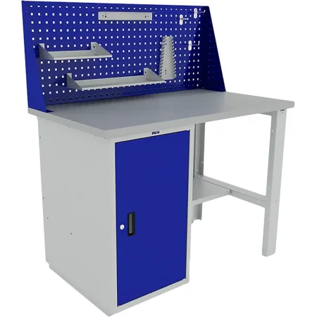 Верстак металлический слесарный предназначен для удобной организации рабочего места на производстве, в учебных заведениях, мастерских и гаражах. Тумба укомплектована двумя съемными регулируемыми полками и одной дверцей, возможность смены стороны открывания двери. Ключевой замок на дверце тумбы. Нагрузка на полку 30 кг. Максимальная нагрузка на верстак — 750 кг. Дополнительно верстак можно укомплектовать перфорированным экраном соответствующего размера, светодиодным освещением и аксессуарами для инструментов. Данный верстак можно доукомплектовать дополнительным оборудованием (арт. 1165953, 1165958, 2055641, 2055643, 2055642, 473509, 405874, 740187, 473508, 473506, 675805).
