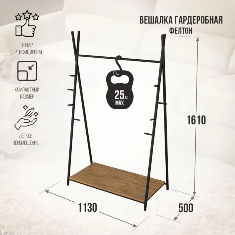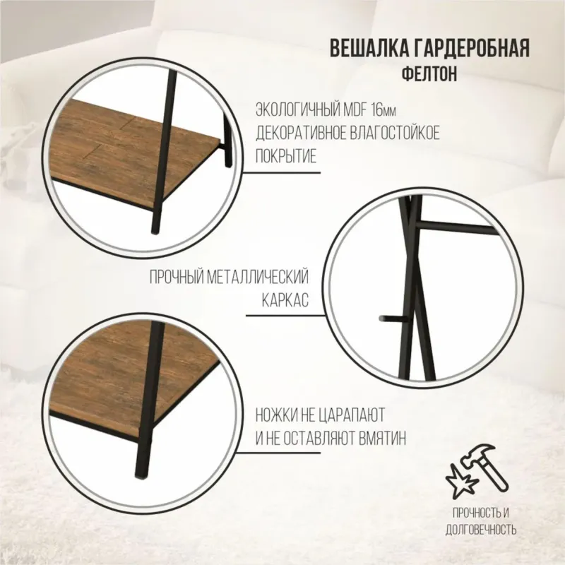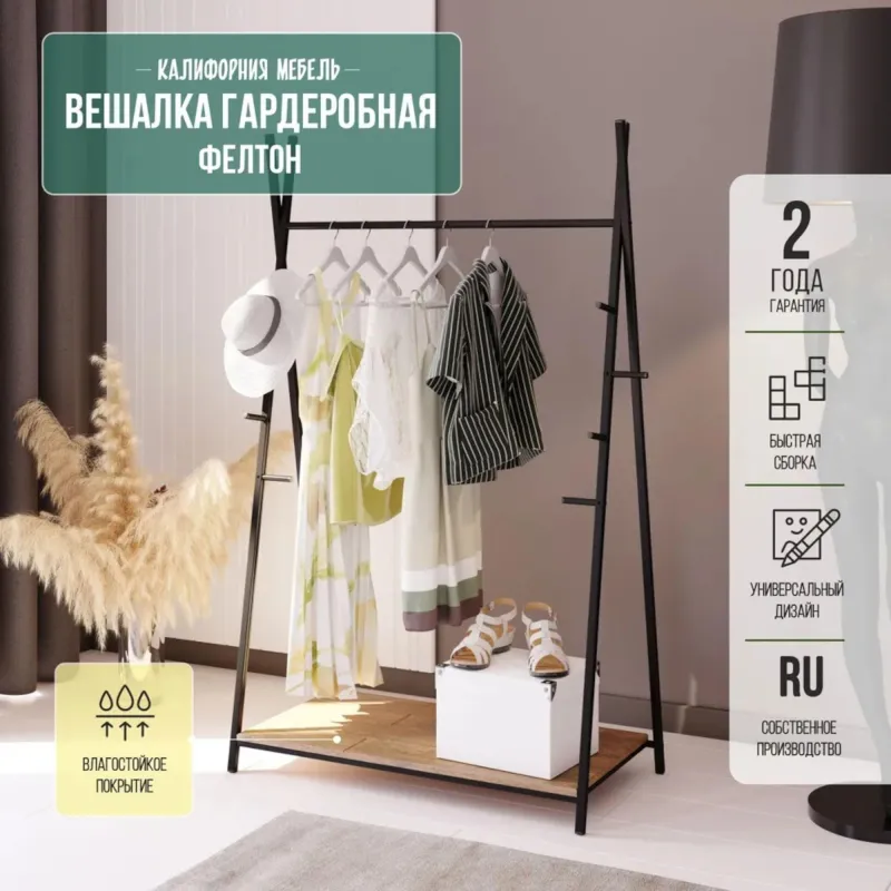 Вешалка гардеробная «Фелтон» — этот друг и помощник облегчит ваш быт и придется к месту не только в прихожей или гардеробной, но в офисе или кабинете. Напольная вешалка — хорошая компания для любителей порядка. Она сделана в современном стиле и представляет собой стильный, многофункциональный предмет мебели. Прочный сборный каркас выполнен из металла и окрашен в черный цвет. В основании вешалки заключен дизайнерский прием-наборное основание «паркет» из отдельных ламелей. Изящное сочетание материала МДФ, облицованного декоративным покрытием в современных цветовых решениях, и металла смотрится по-настоящему эффектно. Дополняют конструкцию вешалки металлические крючки для аксессуаров. Данная модель вешалки станет оригинальным украшением интерьера. Продукция поставляется в разобранном виде, упакованная в гофрокартон. В комплект входит вся необходимая фурнитура и удобная инструкция для сборки.