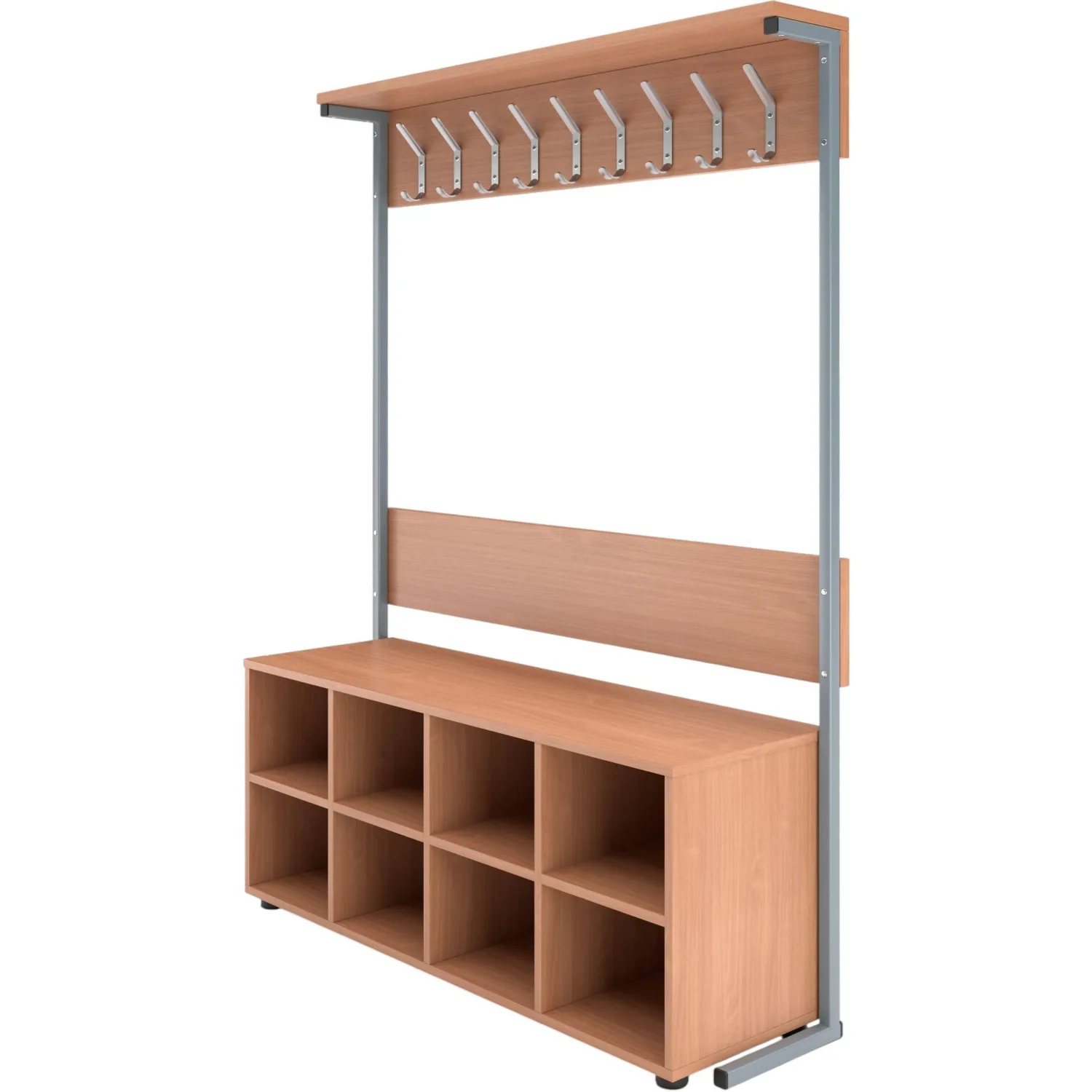 Вешалка односторонняя с тумбой для обуви. Каркас вешалки выполнен из металлического профиля 25×25 мм, с толщиной стенок не менее 1,2 мм, покрыт порошковой краской стойкой к химическим и механическим воздействиям. Панели с крючками и полка для головных уборов выполнены из ЛДСП 16 мм, торцы деталей закрыты противоударной кромкой ПВХ. Вешалка оснащена 9 металлическими крючками. Крючки крепятся к панелям на межсекционные стяжки. Тумба для обуви выполнена из ЛДСП 16 мм, торцы панелей закрыты кромкой ПВХ. Тумба устанавливается на регулируемые по высоте пластиковые опоры.