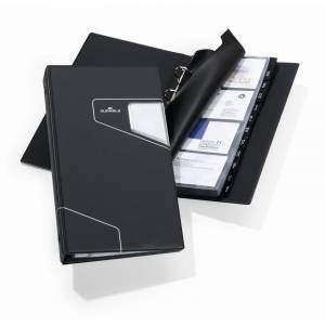 Вертикальная настольная визитница Durable Visifix Pro имеет матовую поверхность с имитацией под натуральную кожу черного цвета. Внутренний блок рассчитан на 200 визиток. Каждый лист вмещает четыре визитки или банковские карты стандартного размера. Визитница выполнена на кольцах, каждый лист формата А4 имеет 20 съемных карманов. В комплект входит буквенный разделитель. Вместимость может быть увеличена на 10 карманов.