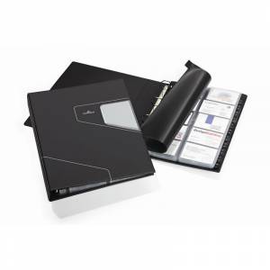 Вертикальная настольная визитница Durable Visifix Pro имеет матовую поверхность с имитацией под натуральную кожу черного цвета. Внутренний блок рассчитан на 400 визиток. Каждый лист вмещает восемь визиток или банковских карт стандартного размера. Визитница выполнена на кольцах, каждый лист формата А4 имеет 20 съемных карманов. В комплект входит буквенный разделитель. Вместимость может быть увеличена на 10 карманов.