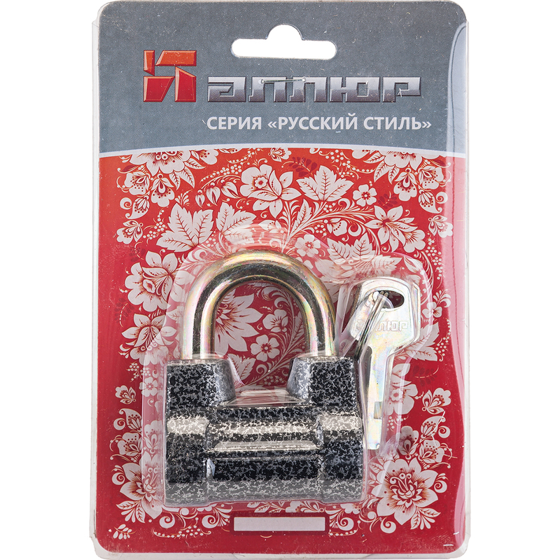 Серия «Русский стиль». Замок навесной. Материал корпуса — алюминиевый сплав, полимерное покрытие. Ширина основания корпуса — 54 мм, диаметр дужки 10 мм. Дисковый механизм секрета, 3 ключа с двойной нарезкой секрета. Изображения товаров на сайте не могут гарантировать точную цветопередачу.