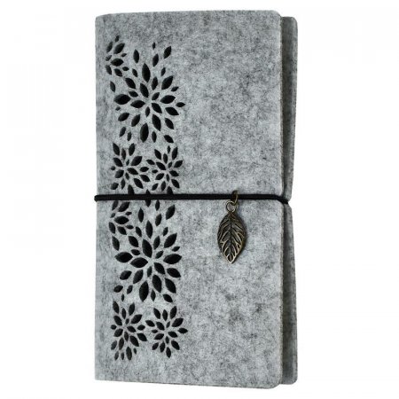 Записная книжка формата A6+. Мягкая фетровая обложка с вырубкой, декоративная застёжка-резинка с металлической фигуркой, внутренний блок на металлических кольцах. 160 страниц. Тонированная офсетная бумага плотность 70 г/кв.м, крафтовая бумага плотностью 70 г/кв.м. Материал: фетр (обложка), бумага. Размер изделия: 12x19 см.
