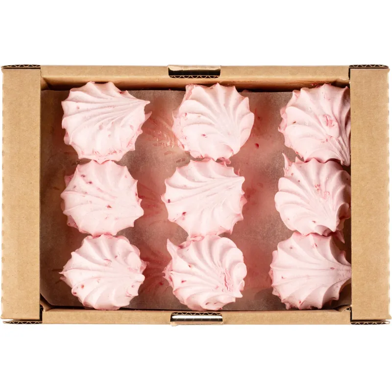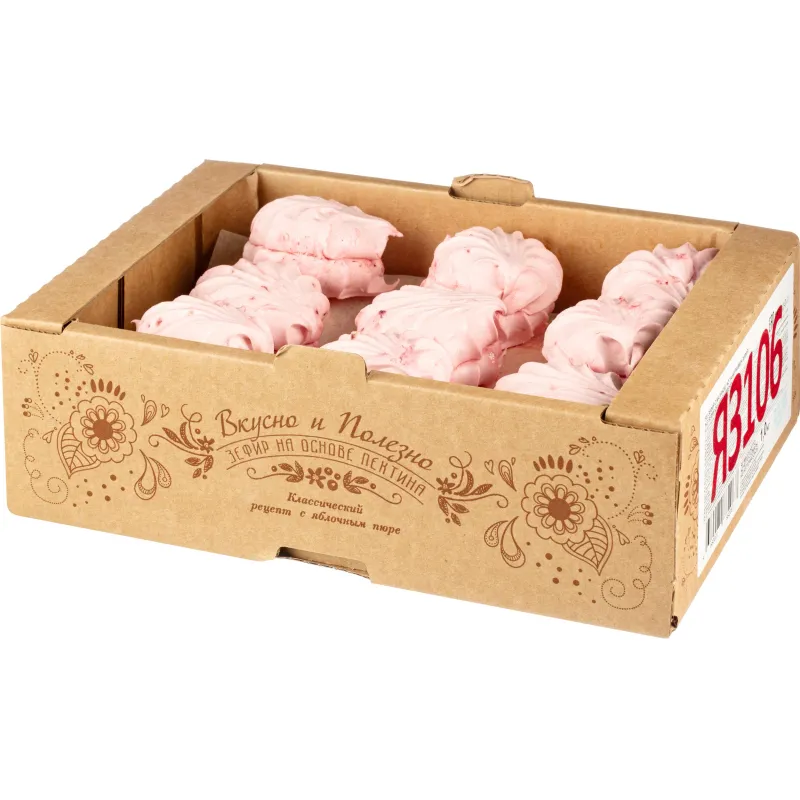 Зефир на 100% натуральном яблочном пюре с кусочками малины. Классическая рецептура! 0% жира. На яблочном пектине — природном загустителе. Без консервантов.