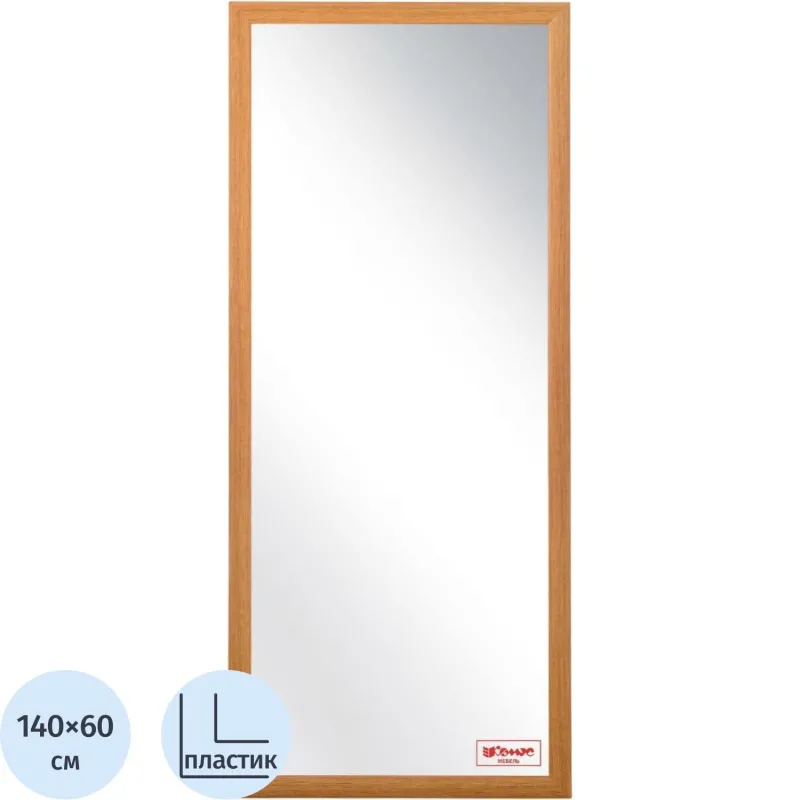 Зеркало настенное Комус Мебель НБ68 в багетной раме из влагостойкого вспененного полистирола. Зеркальное полотно марки Mirrox 3G влагостойкое, экологически чистое. Толщина составляет 4 мм. Размер 60×140 см. Зеркало обрамлено влагостойкой рамой из ПЛС цвета бук, ширина рамы — 40 мм. Упаковано в целлофан, в коробку из трёхслойного ударостойкого гофрокартона марки Т24. Крепежи к стене — скрытые пластины, позволяющие вешать зеркало как вертикально, так и горизонтально. В комплекте имеется дюбель-костыль.
