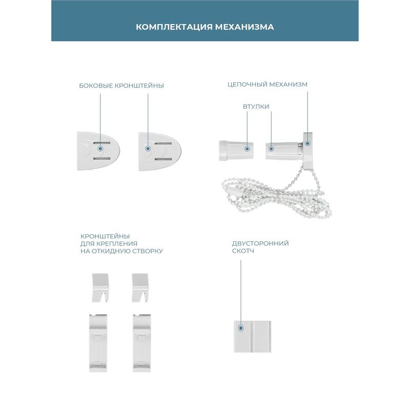 Комплектация товара. Рулонная штора в сборе: металлический вал (D1,7 см), ткань, вшитый пластиковый утяжелитель. Механизм в сборе (D1,7 см), пластиковая цепочка управления, крепление на откидную створку окна без сверления, инструкция по установке.