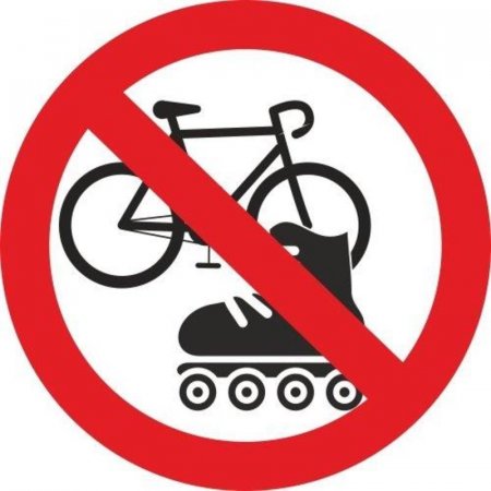 Знак безопасности «Вход с велосипедами и роликами запрещен». Код знака: D150. Место размещения (установки) и рекомендации по применению: Знак для торговых организаций, офисов, общественных организаций (музеи, галереи и прочее) Используемые материалы: пленка самоклеящаяся ПВХ. Диаметр: 150 мм.