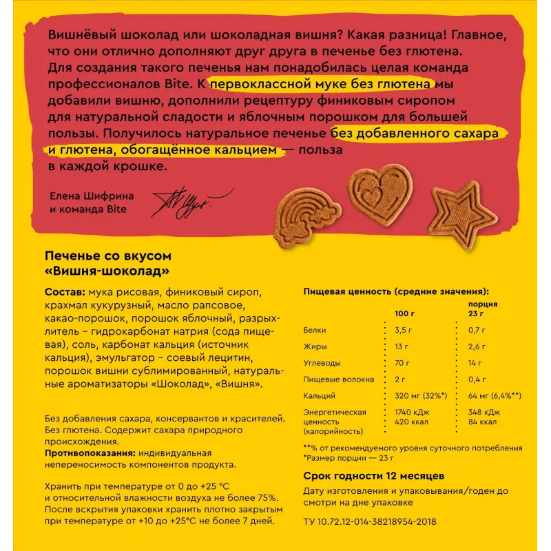 Печенье Bite «Вишня-шоколад» — десерт без глютена и сахара. Состав включает рисовую и кукурузную муку, подсолнечное масло, какао-порошок, яблочный порошок, соль, соду пищевую, карбонат кальция, лецитин соевый и натуральные ароматизаторы «Вишня» и «Шоколад». Для сладости добавлен финиковый сироп, а бельгийский шоколад и вишня создают насыщенный вкус.