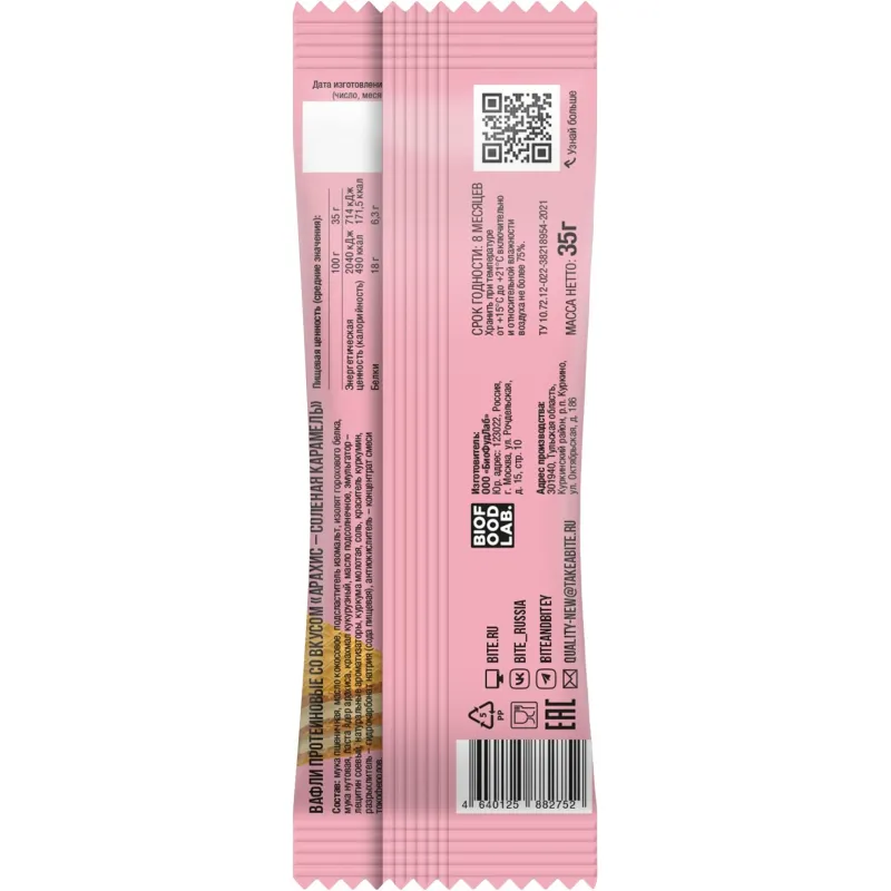 Вафли Bite со вкусом арахис-солёная карамель — хрустящий десерт без сахара. Вместо сахара используется изомальт с гликемическим индексом 2, который безопасен для зубов и улучшает пищеварение, действуя как пребиотик. Вес одной вафли — 35 г, в упаковке флоу-пак 1 штука.